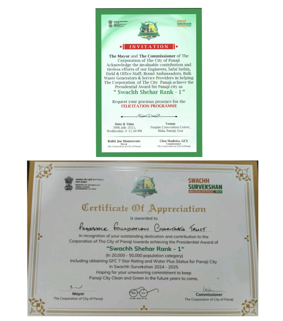 Feedback Foundation was honoured with a certificate of appreciation by Corporation of Panaji for its outstanding contribution to ‘Swachha Seher Rank 1’ in Swachha Survekshan 2025.
