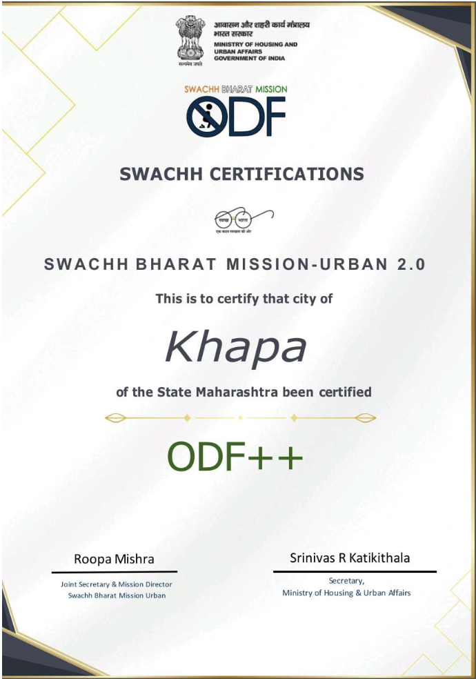 A milestone achievement by Khapa Nagar parishad, Nagpur, Maharashtra for getting ODF++ Status