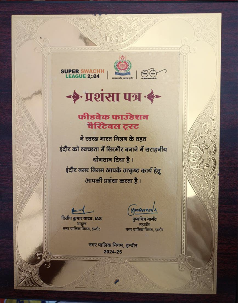 Feedback Foundation has been conferred the prestigious 'Swachhata Champion Award' by the Nagar Palika Nigam, Indore, in recognition of its exceptional service and outstanding contributions to the Swachh Bharat Mission (Urban) 2.0.