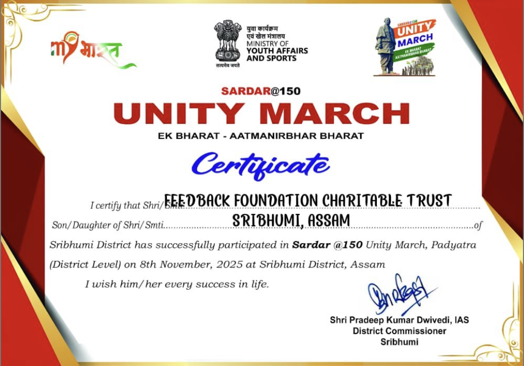 Feedback Foundation received a prestigious certificate from Shribhumi District Administration, Assam, recognizing its active participation and strong support in the Unity March. This accolade highlights the organization's dedication to community unity and social initiatives.