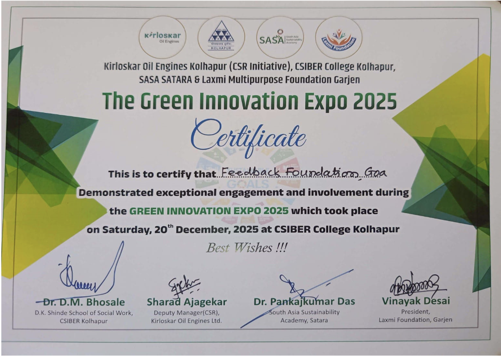 The Feedback Foundation Charitable Trust was honored for demonstrating exceptional engagement and innovation at the ‘Green Innovation Expo 2025’, held on Saturday, December 20, 2025, at Kirloskar Oil Engines, Kolhapur (CSR initiative), in collaboration with CSIBER College Kolhapur, SASA Satara, and Laxmi Multipurpose Foundation Garjan.