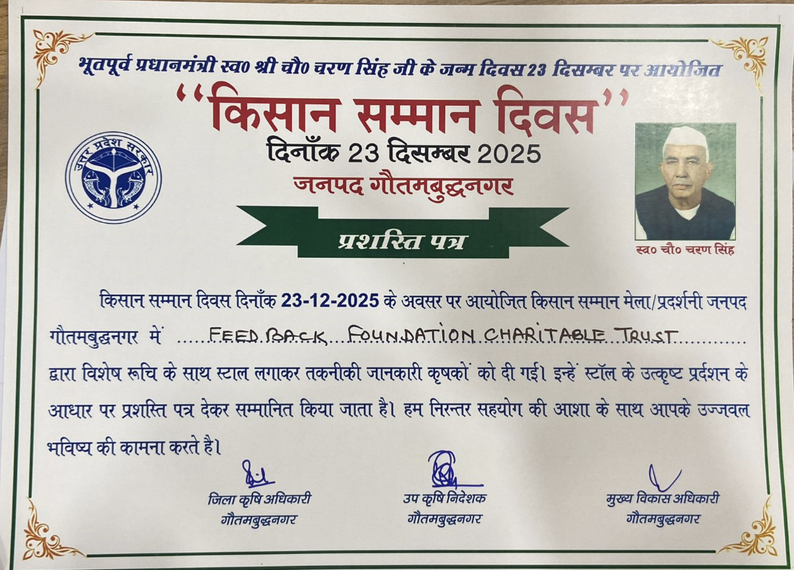 The Feedback Foundation Charitable Trust was honored in Kisan Samman Mela organized at Gautam Buddha Nagar on 23 September 2025 for demonstrating exceptional engagement and technical expertise given to farmers at the information stall . This recognition underscores our commitment to transformative environmental projects across India.