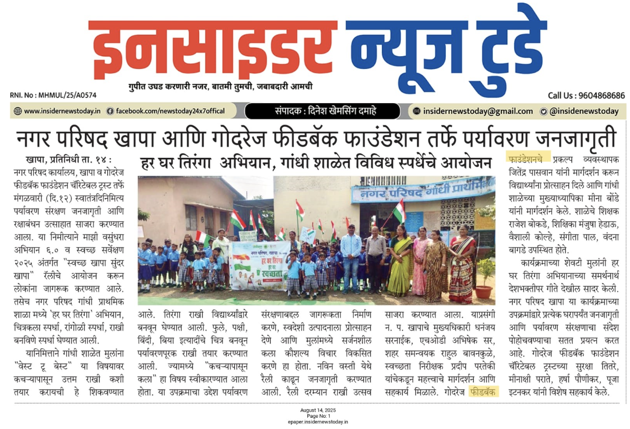 The Khapa Municipal Council and Feedback Foundation Charitable Trust on the occasion of 15th October 2025, jointly conducted a awareness campaign. During which under ‘mazi Vasundhara programme 6.0 and Swachha Survekshan 2025 programme ‘ Swachha Khapa Sunder Khapa’ rally was organized with Nagar Parishad Gandhi Primary School. Students, teachers, and councilors, participated in the event. Excellent awareness was created through hands-on activities by students on ‘Waste to Best’. At the end of the event under ‘Har Ghar Tiranga’ initiative all the kids sang patriotic songs.  Under Feedback Foundation's guidance, momentum was added to the Swachh Bharat Mission.