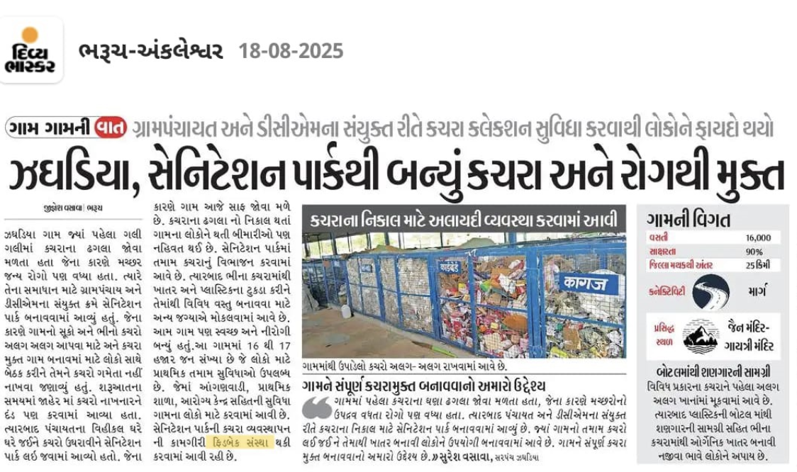 In a remarkable achievement for rural sanitation, Jhaghadiya village in Bharuch-Ankleshwar District has transformed its solid waste management through dedicated waste management efforts into a clean, disease-free sanitation park. The park has been established for all 4 types of domestic waste processing, eliminating landfill dependency. The joint waste collection facility between Gram Panchayat and DCM (District Collector’s office or a partner) benefits the entire community, with over 5,000 households managed effectively.​