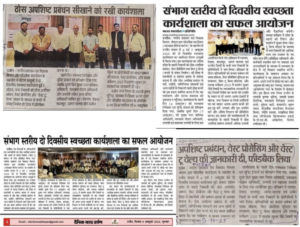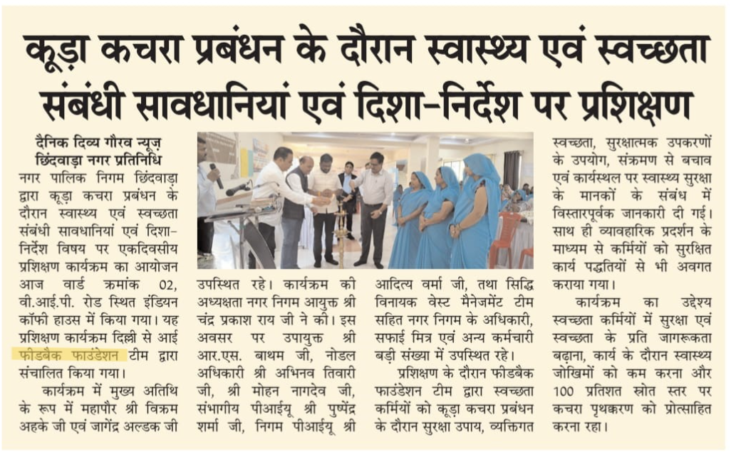 Chhindwara Municipal Corporation along with Feedback Foundation as a SKP hosted a one-day training on health and hygiene guidelines for waste management at Indian Coffee House, VIP Road, Ward No. 2. Feedback Foundation’s expert master trainers led the session, focusing on safety for sanitation workers. Mayor Shri Vikram Ahke and Jagendra Aldak were chief guests, with Commissioner Chandra Prakash Rai presiding. Attendees included Deputy Commissioner R.S. Batham, Nodal Officer Abhinav Tiwari, and sanitation teams. Practical demos covered protective gear, infection prevention, and safe practices.The training aimed to boost hygiene awareness, cut health risks, and promote 100% source segregation. It equipped workers with standards for workplace safety and personal hygiene in waste handling.