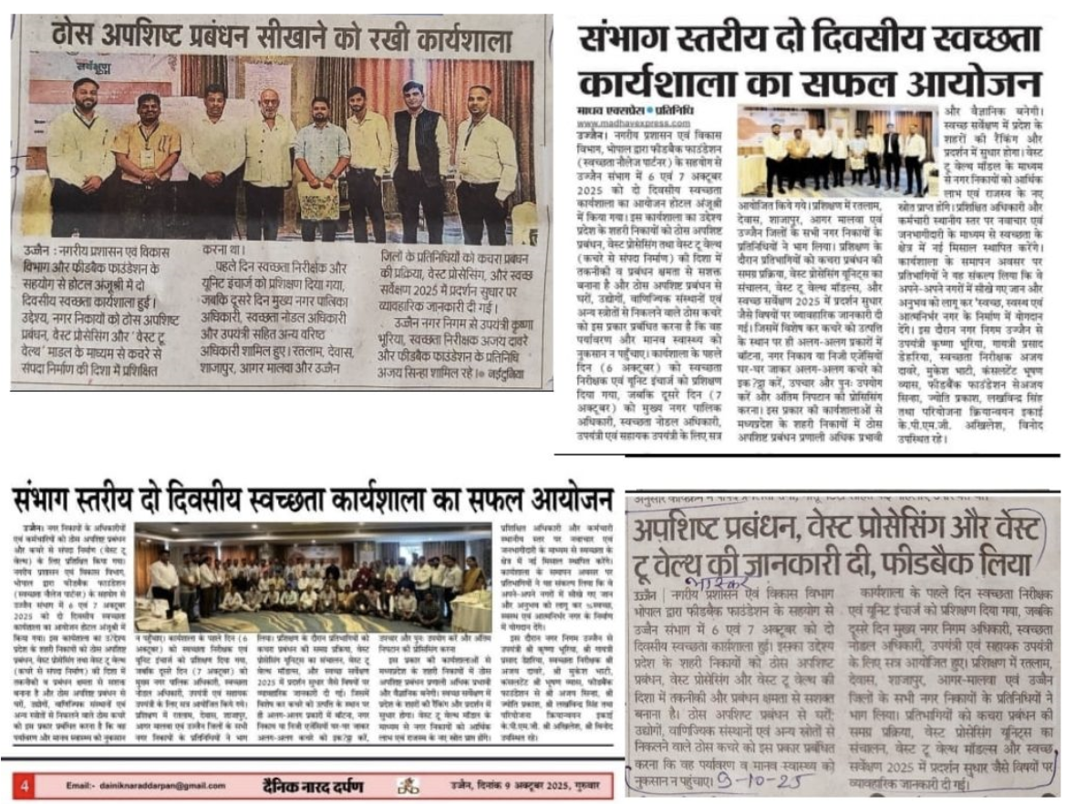 A highly successful two-day sanitation workshop organized by Feedback Foundation as Swachhata Knowledge Partner to The Urban Administration and Development Department (UADD) of the Government of Madhya Pradesh. Held October 6-7, 2025 at Hotel Anjushree, Ujjain, the event empowered urban bodies from Ratlam, Dewas, Shajapur, Agar Malwa, and Ujjain districts with solid waste management expertise. Day 1 trained sanitation inspectors on waste processing operations and Waste-to-Wealth models. Day 2 targeted Chief Municipal Officers, Nodal Officers, and engineers with Swachh Survekshan 2025 performance strategies. Key topics included source segregation, door-to-door collection, treatment, reuse, and scientific final disposal. Participants pledged to implement learnings for cleaner, self-reliant cities with economic benefits. The initiative promises improved Madhya Pradesh Swachh Survekshan urban rankings and innovative local cleanliness models.