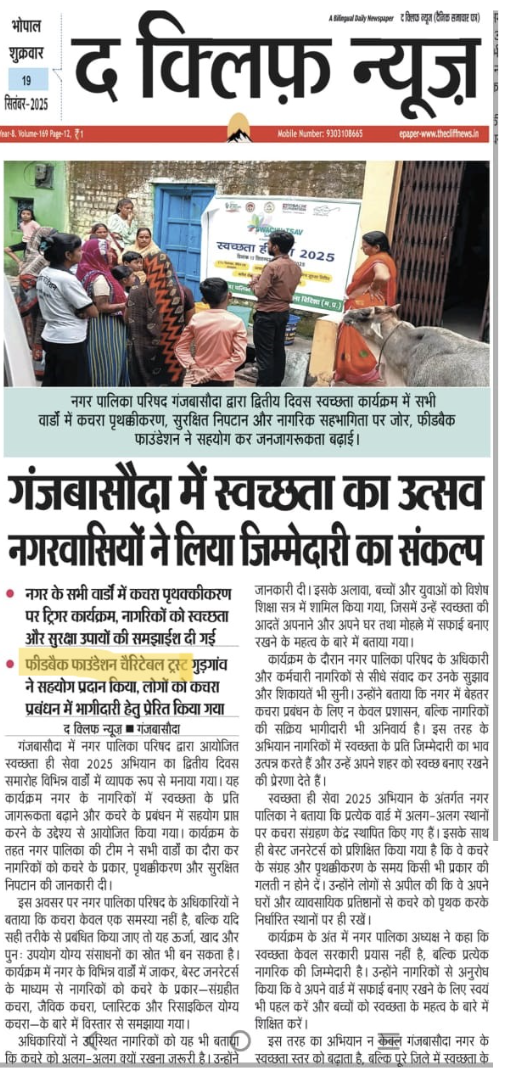 Ganjbasoda Nagar Palika Parishad's successful second day of Swachhta Hi Seva 2025, reaching all city wards with waste segregation drives. Feedback Foundation Charitable Trust collaborated to boost public awareness on cleanliness, safe disposal, and citizen participation. Municipal teams educated residents on waste types—organic, plastic, recyclable—explaining segregation benefits and conversion to energy, fertilizer, and resources. The team conducted door-to-door sessions, while children and youth attended special hygiene workshops. Waste collection centers were established across wards with trained staff.