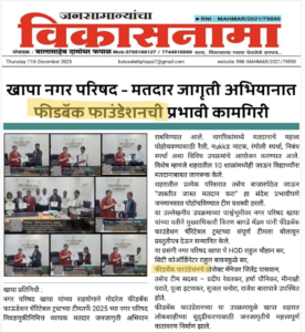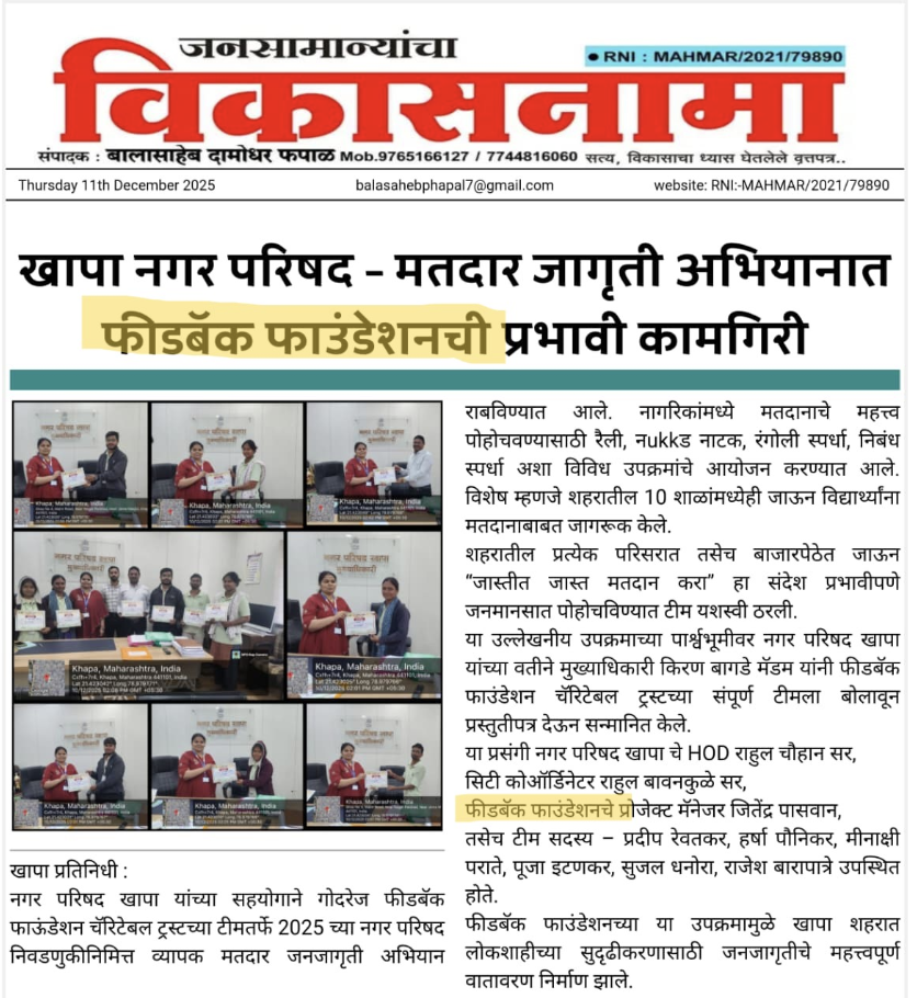 Janasamancha Vikasnama reports outstanding performance by Feedback Foundation Charitable Trust in Khapa Nagar Parishad's 2025 Municipal Council elections voter awareness drive. The team collaborated with local authorities, reaching every corner of the city through innovative outreach.