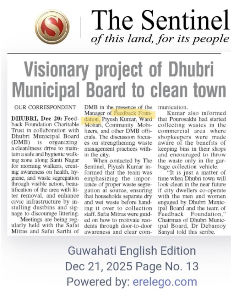 Feedback Foundation with Dhubri Municipal Board (DMB) conducted a comprehensive cleanliness drive along Santi Nagar for safe and hygienic walking zone. The initiative promotes health, hygiene, waste segregation awareness, litter removal, dustbin installation, and anti-littering signage for safer civic spaces. Regular meetings with Safai Mitras, Safai Sarthi, and community mobilizers strengthen city-wide waste management. Door-to-door campaigns emphasize source segregation of dry/wet waste. The team now collect waste from commercial area and are equipped with bins. DMB Chairman Dr. Debamoy Sanyal predicts a cleaner Dhubri soon with citizen cooperation. Piyush Kumar highlights resident motivation through clear communication and door to door waste collection.
