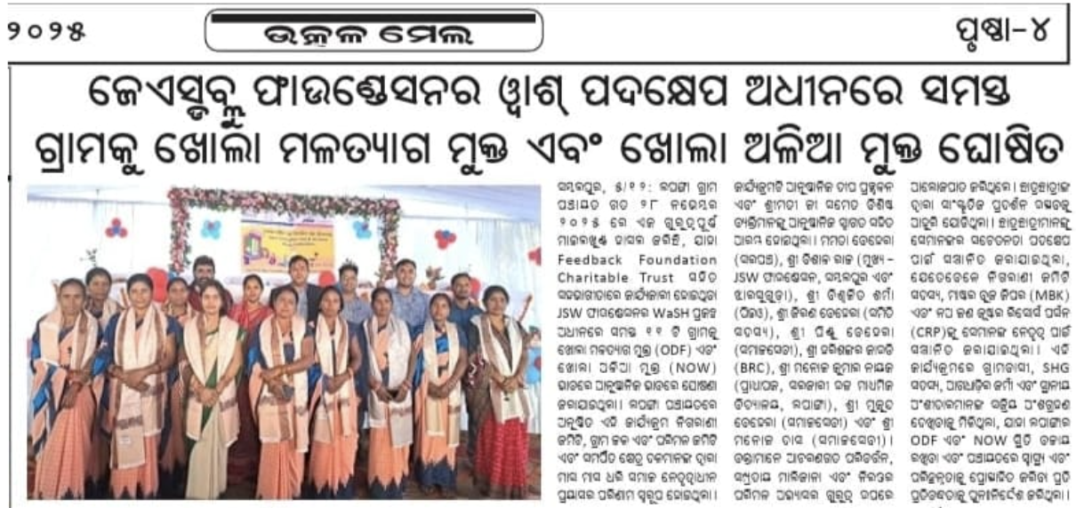 On November 28, 2025, Lapanga Gram Panchayat marked a historic milestone: all 11 villages declared Open Defecation Free (ODF) and No Open Waste (NOW) under JSW Foundation's WaSH Project, implemented with Feedback Foundation Charitable Trust.